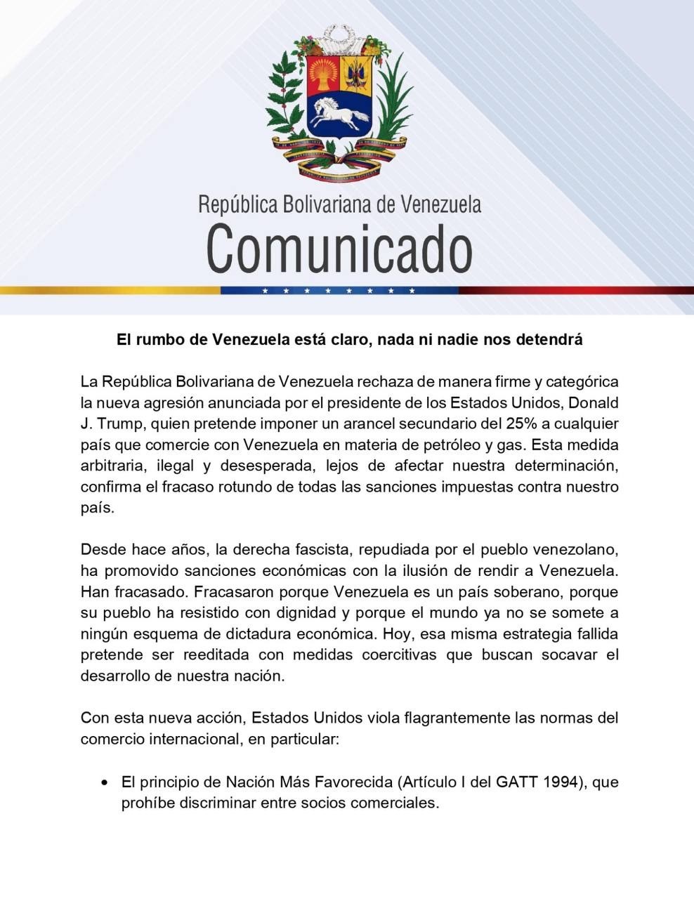 Mediante un comunicado, dado a conocer por el vicepresidente sectorial de Comunicación y Cultura, Freddy Ñáñez, en sus redes sociales, señala que "Venezuela rechaza de manera firme y categórica la nueva agresión anunciada por el presidente de los Estados Unidos, Donald Trump, quien pretende imponer un arancel secundario del 25% a cualquier país que comercie con Venezuela en materia de petróleo y gas".