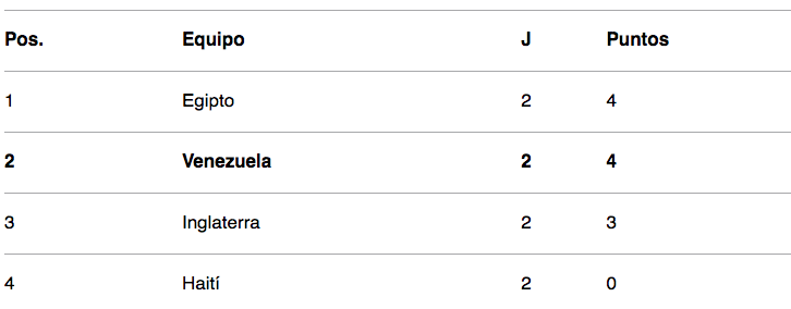 La goleada de Inglaterra (8-1) sobre Haití ha inyectado dramatismo al grupo, ya que los "Three Lions", que habían caído en el debut ante Venezuela, ahora se ubican a solo un punto de la cima. Venezuela y Egipto comparten el liderato con cuatro unidades cada uno.